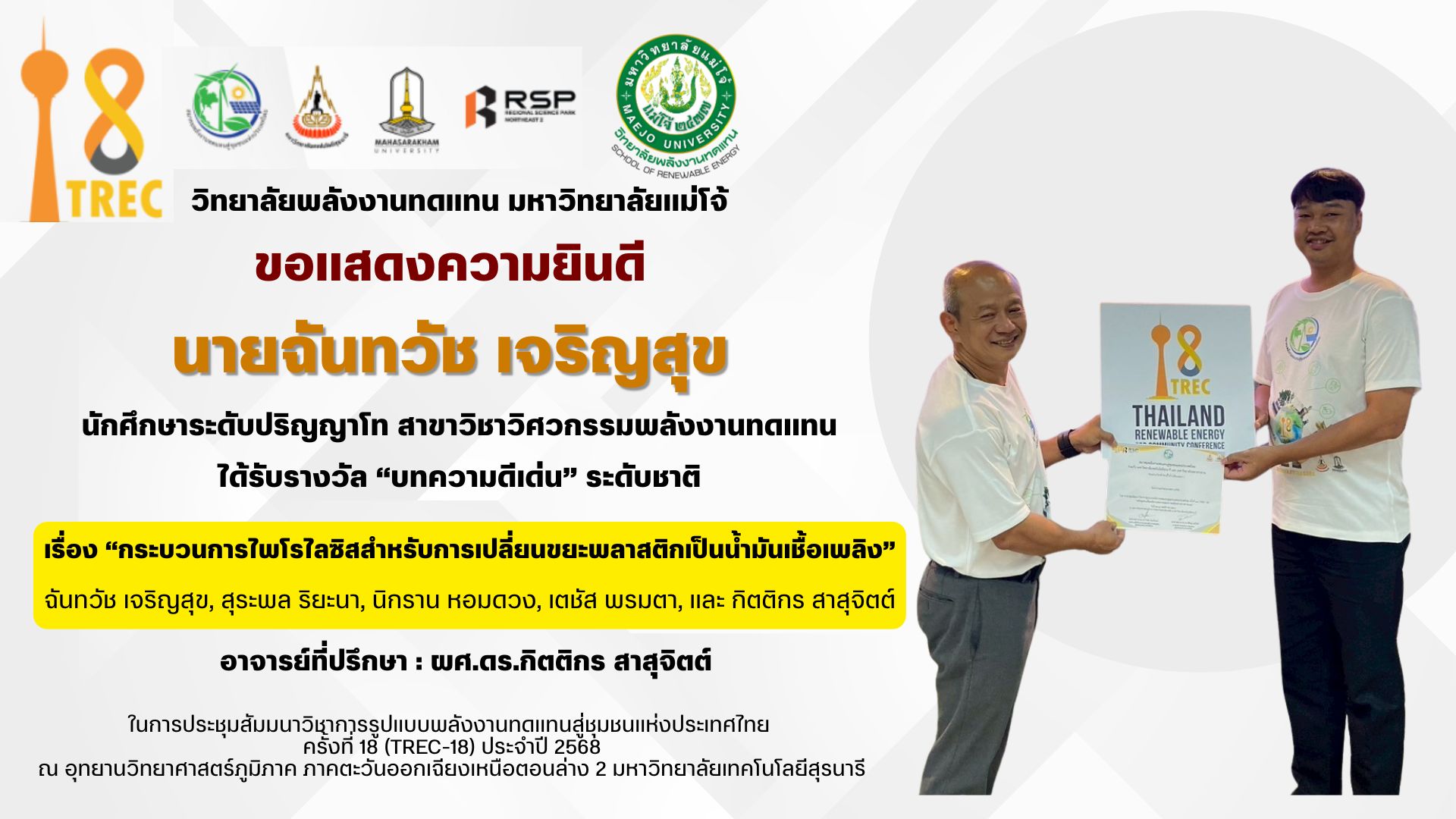 วิทยาลัยพลังงานทดแทน มหาวิทยาลัยแม่โจ้ ได้เข้าร่วมการสัมมนาประชุมวิชาการรูปแบบพลังงานทดแทนสู่ชุมชนแห่งประเทศไทย ครั้งที่ 18 ดำเนินการโดย สมาคมพลังงานทดแทนสู่ชุมชนแห่งประเทศไทย ร่วมกับ มหาวิทยาลัยเทคโนโลยีสุรนารี และ มหาวิทยาลัยมหาสารคราม ภายใต้ชื่องาน: “พลังชุมชนเพื่อพลังงานสะอาดและความเป็นกลางทางคาร์บอน : นวัตกรรมเพื่อการใช้ทรัพยากรอย่างยั่งยืน”